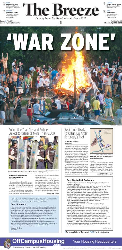 I hadn’t been on the job as editor-in-chief at our university newspaper for two weeks when a riot broke out at an annual block party. Immediately, I led my team of student photographers, editors and reporters to produce an issue that was sought after across campus. Our award-winning photographs were later seized illegally by the local commonwealth’s attorney, setting off a national legal controversy and media storm. Ultimately, I negotiated for sharing a small selection of photos (none of which were used to charge anyone), and the commonwealth’s attorney issued a public apology.