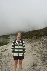 The wind whips around us on the top of Croagh Patrick and we can’t see anything below because of the clouds and the fog. Every so often, the grey clears to real a spot of blue sky above Westport’s blue harbor dotted with islands. The wind moves the clouds so fast we don’t even have time to get our cameras out. Rain sounds like hail as it gently hits the ground and our sturdy raincoats. Soft grass covers a small patch on the side of the mountain in front of our rocky seats, but below we see rocks, rocks, and more rocks.