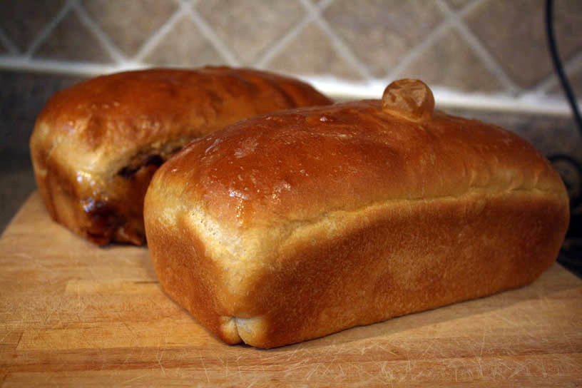 Let the dough rise until doubled (1 to 2 hours). (If using whole wheat, the dough won’t completely double.) Deflate the dough and knead out any stray bubbles, cut it in half and form two loaves. Place them in two lightly greased 8½ x 4½ pan-inch bread pans. Let rise until almost doubled (45 minutes to 1 hour).