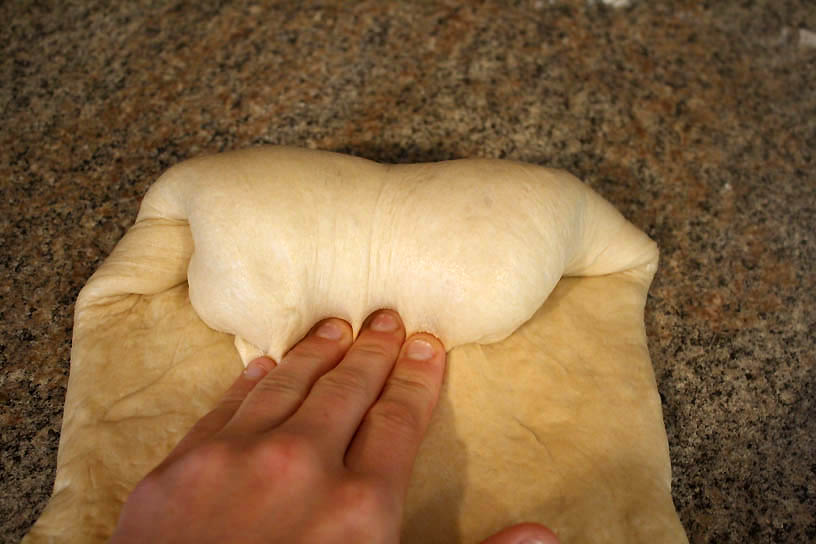 Continue down the length of the dough, rolling as you go to squeeze out air.