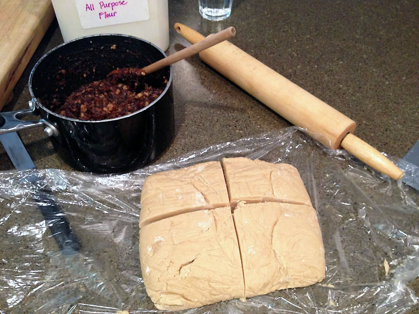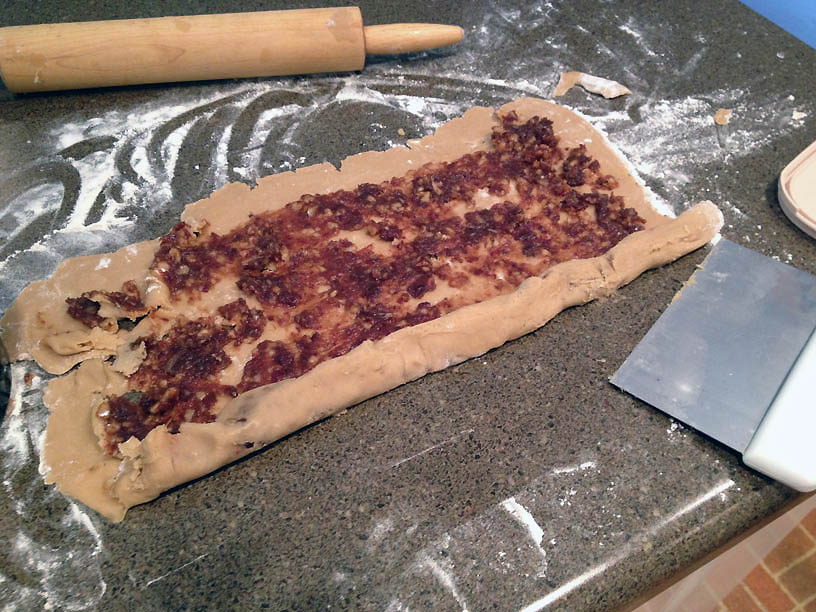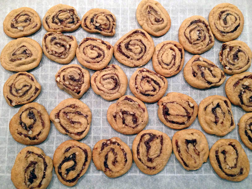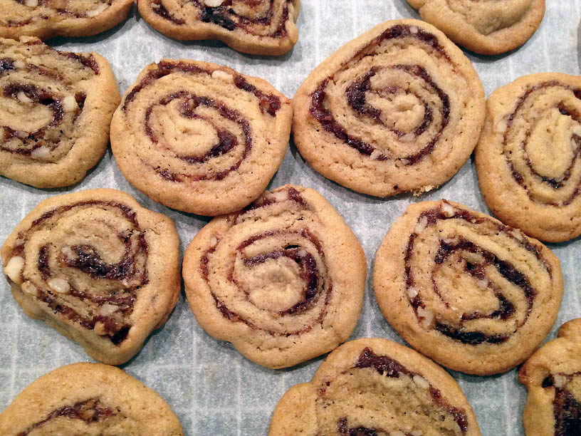 The recipe had step after step, and it looked like a lot more work than I ever realized. First the buttery dough has to be made and refrigerated overnight in three or four balls, then the date filling with chopped nuts and sugar has to be cooked on the stove and cooled. After the dough is rolled out over the countertop, you spread on the unusually thick filling, taking care not to tear the thin dough; years later, I still can’t do it quite right, but you can’t tell at the end. Each piece is rolled into a log, again refrigerated for a few hours, sliced into quarter-inch pieces and finally baked. It’s at least a two-day process.